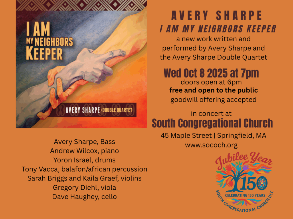 South Church invites the public to a free concert featuring the premiere of a powerful new work, “I Am My Neighbor’s Keeper,” by the renowned composer and world-class jazz bassist, Avery Sharpe. The 90-minute performance will take place on Wednesday, October 8, at 7 p.m., at the South Church sanctuary, located at 45 Maple Street in Springfield.